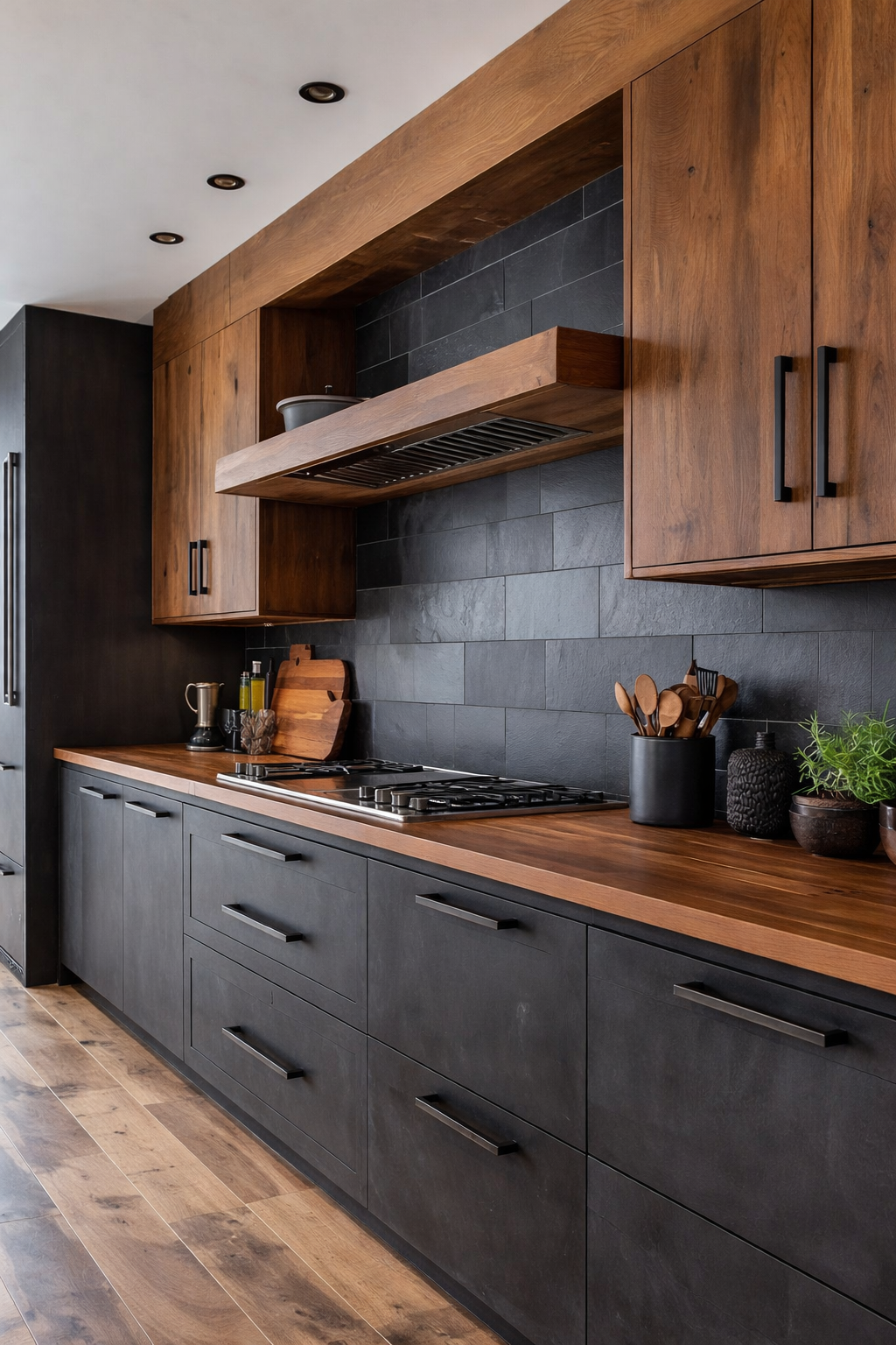 Кухня с графитовыми фасадами и теплыми деревянными поверхностями: цельная столешница, черная плитка в фартуке и встроенная техника для открытой гостиной.